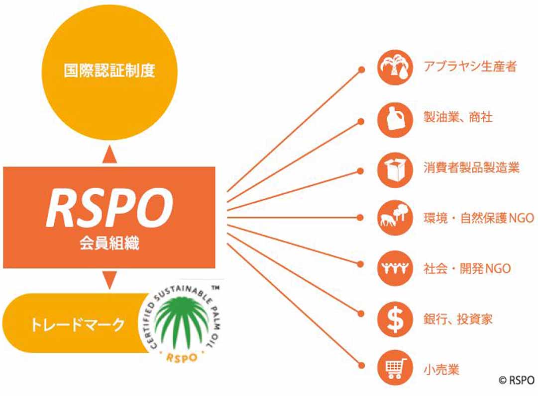 では一体どのように行動すれば、解決することができるのでしょうか?方法の一つとして、環境等に与える負荷が少ない方法で 生産されたパーム油を使用するというものがあります。2004年にWWFなど7つの関係団体によりRSPO(持続可能なパーム油のための円卓会議) という国際的な組織が設立しました。独自の認証制度を導入し、熱帯林の保全や、そこに生息する生物の多様性、森林に依存する 人々の暮らしに深刻な悪影響を及ぼすことのないように「持続可能なパーム油」の生産と利用を促進し、認証のパーム油を購入して もらうよう消費者側に働きかけています。