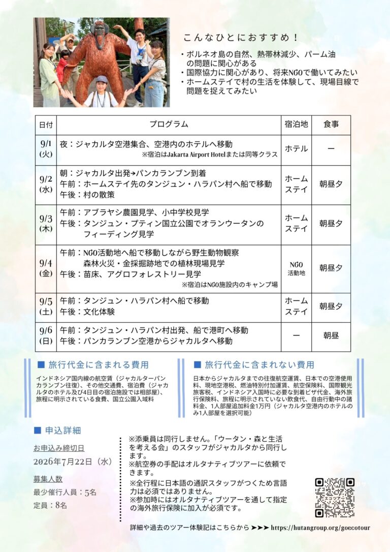 添乗員は同行しません。 「ウータン・森と生活を考える会」のスタッフがジャカルタから同行します。