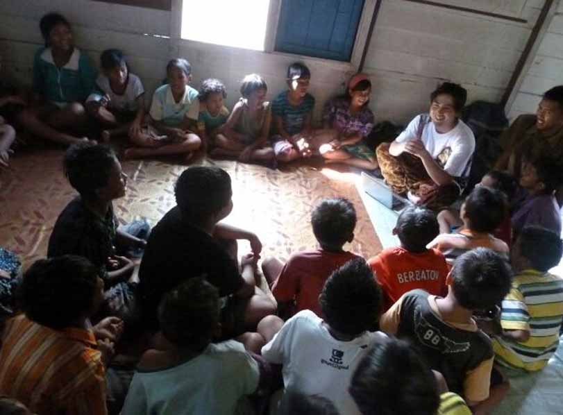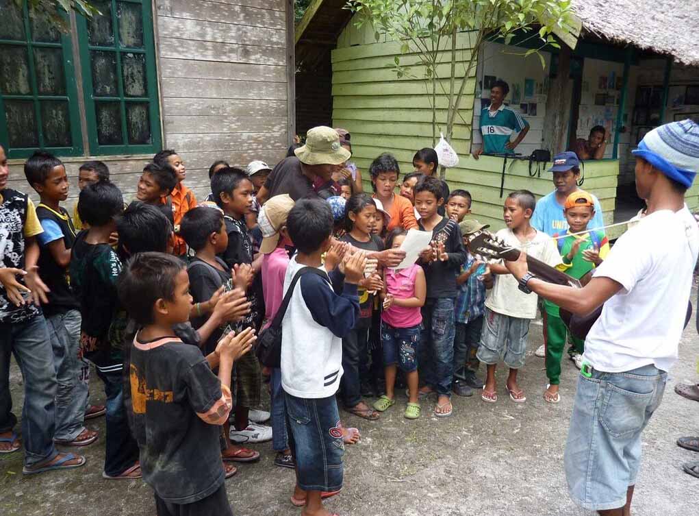 子どもたちの明るい歌声がタンジュンプティン国立公園の森に響きわたる。今日はタンジュンハラパン村の月に1回の環境教育の日。 参加者は村の子どもたち23人。その後ろには村の小学校教師や保護者たち。FNPF、村の小学校、村人の協働事業です。