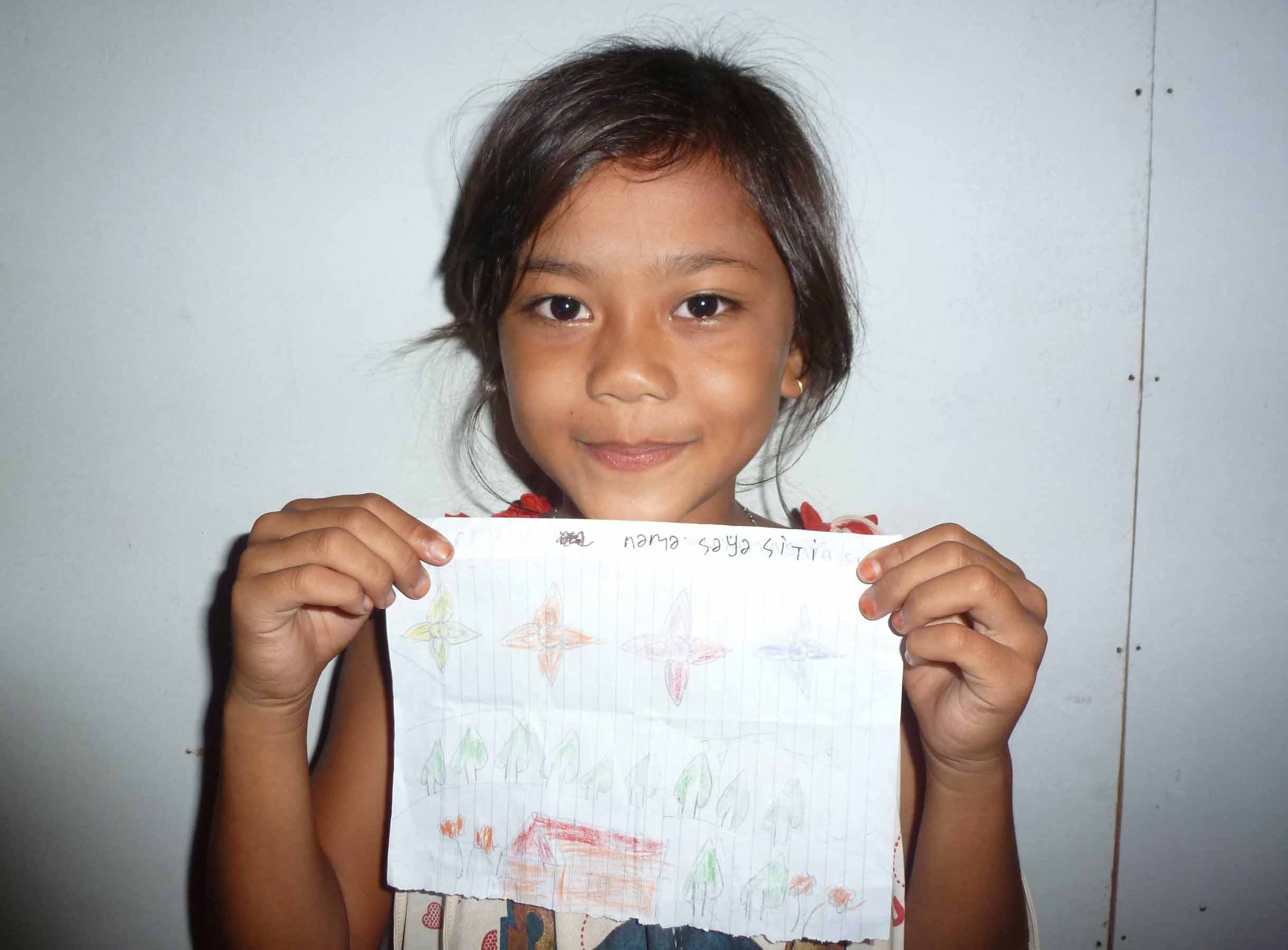 大阪のある小学校では、2012年にパーム油をテーマにした総合学習を一年間かけて行いました。児童たちはパーム油が含まれる商品や 影響を受ける動物たちなどを調べ、壁新聞を作り、大人顔負けの発表をしてくれました。そして、「パームオイルと私たちの生活」という テーマでタンジュンハラパン村の子どもたちにお手紙をくれました。その後、ウータンのメンバーが村を訪れた時に、日本の子どもたちの メッセージを紹介しました。村の子どもたちは早速お返事をかいてくれました。