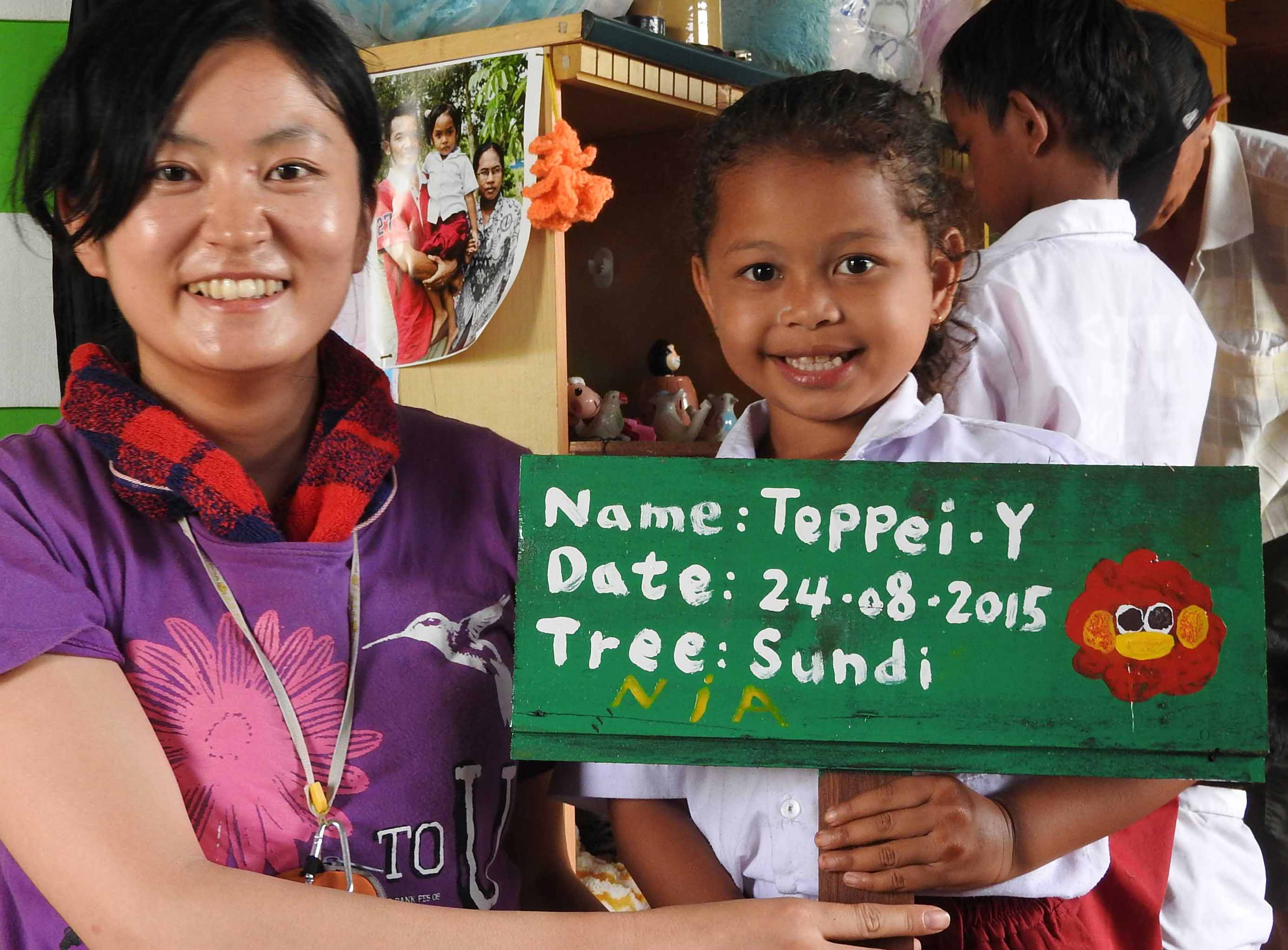 入った植樹看板を子どもたちと作り、村の周りや国立公園などに一緒に植えています。