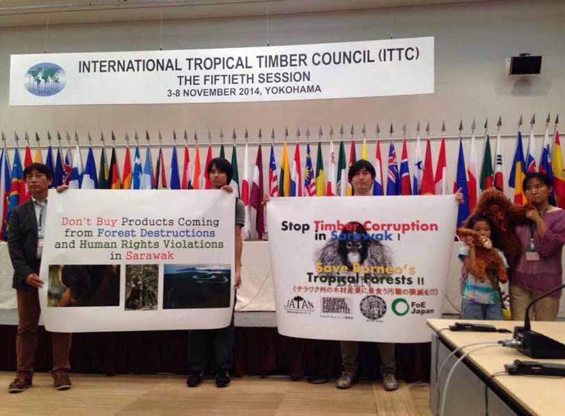 国際熱帯木材機関(ITTO)は熱帯林資源の保全や持続的経営、及び利用等を促進するために1976年に設立された横浜に本部を置く 国連条約機関です。参加している72ヶ国で、世界の熱帯森林面積の約 80%、世界の熱帯木材貿易の90%を占めています。ウータンは 国内外のNGOと協力して横浜で行われるITTO理事会に参加、主に木材のための違法伐採や違法貿易を停止する対策をとるように 訴えてきました。それまで重い腰をあげなかったITTOも、NGOの要請と国際的な流れによって、違法材取引調査やデータの公表、 関係決議を始めました。2014年の50回理事会では「サラワク州の木材産業に巣食う汚職の撲滅を!」と書かれたバナーを日本のNGOで 掲げアピールしました。