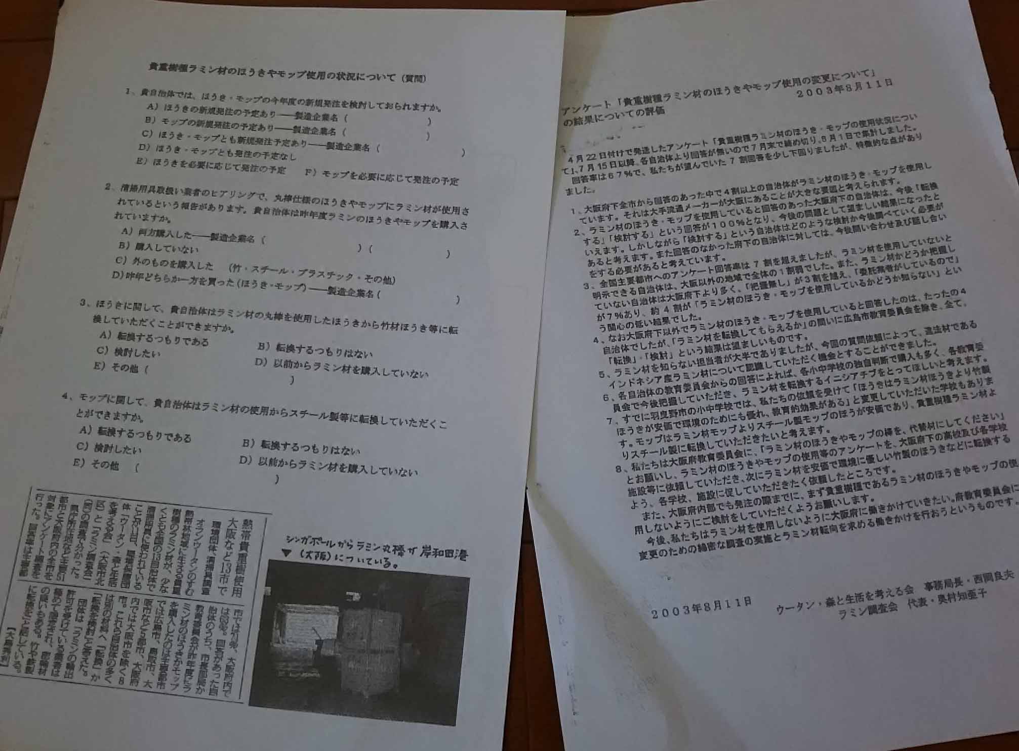 この成功例を契機に全国の県庁所在地の市(52ヶ所)、大阪府全市(33ヶ所)へ「ほうき・モップに関するアンケート」を行いました。 合わせて企業への働きかけも行い、ほうき・モップメーカー大手2社がラミン材から代替品への変更を表明してくれました。2001年の 活動初期ではラミンという樹種が違法伐採材であることも全く認知されていませんでした。 それでも行政の方や企業の方との話し合いの際に、根気強く説明とお願いを一件一件行っていきました。